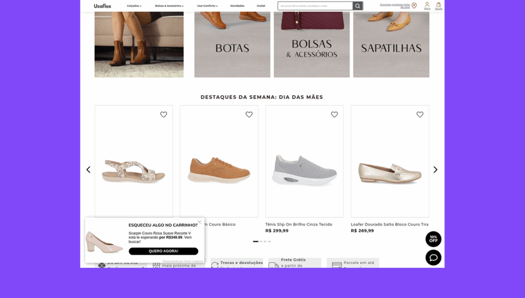 A Smart Audience, integrada ao e-commerce da Usaflex, coleta mais de 40 milhões de eventos de comportamento de 1.5 milhões de seus consumidores todos os meses. Respeitando as orientações da LGPD, a plataforma cria dezenas de audiências segmentadas para campanhas de marketing e CRM hiper personalizadas.