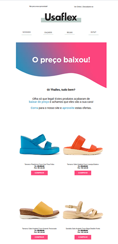 Campanhas de recomendação:Através dos dados de navegação, conseguimos entender a preferência dos consumidores para criar campanhas de recomendação. Neste caso específico, recomendamos produtos que são do interesse do consumidor e que tenham sido remarcados recentemente, criando o e-mail “Alerta: produtos que baixaram de preço”. Este e-mail tem potencial de alcance e recuperação, alcançando mais7 milhões de envios nos últimos 6 meses. Com taxas de engajamento e conversão significativas para o canal.